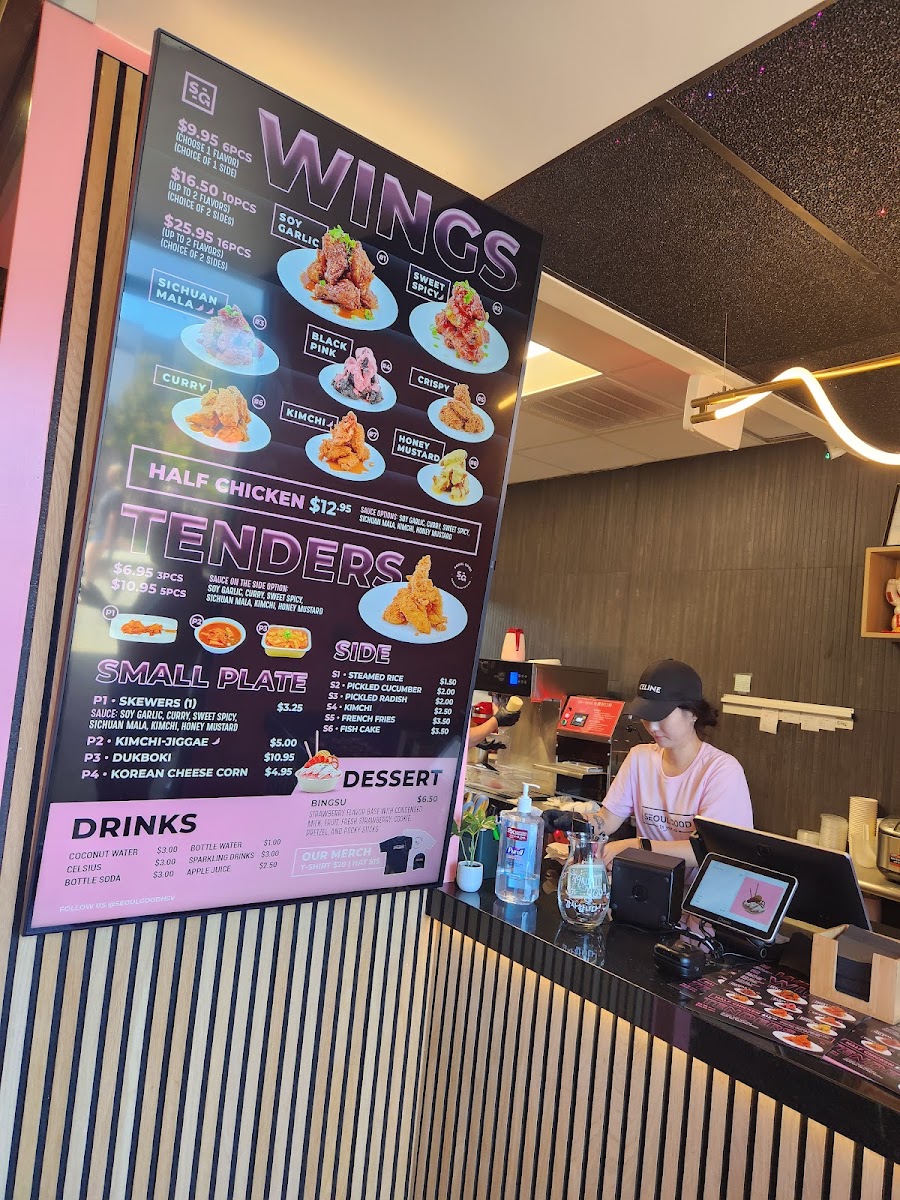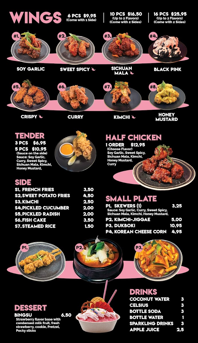 Sixteen crispy wings with your choice of two sauces: soy garlic, sweet spicy, Sichuan mala, black pink, plain, curry, kimchi, or honey mustard.