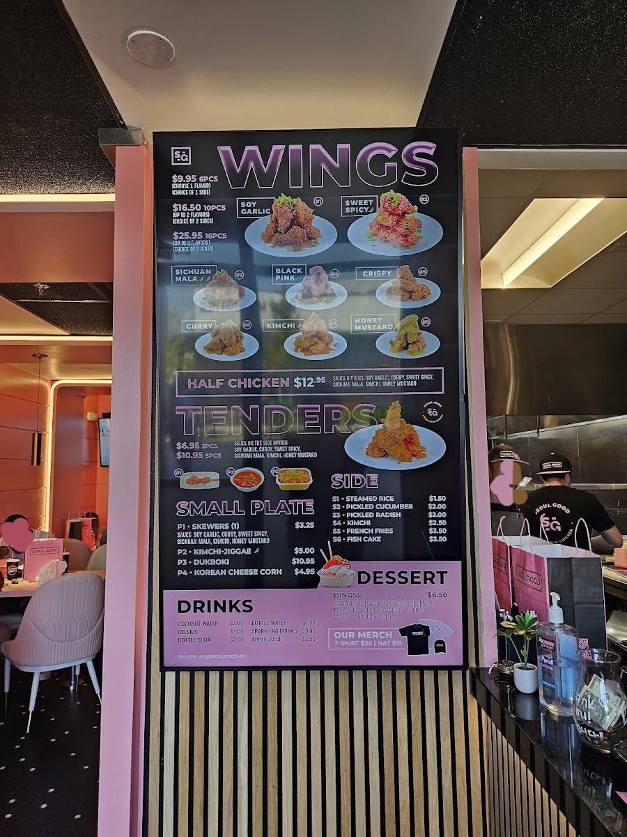 Black T-shirt featuring "Seoul Good Korean Fried Chicken" in pink text.