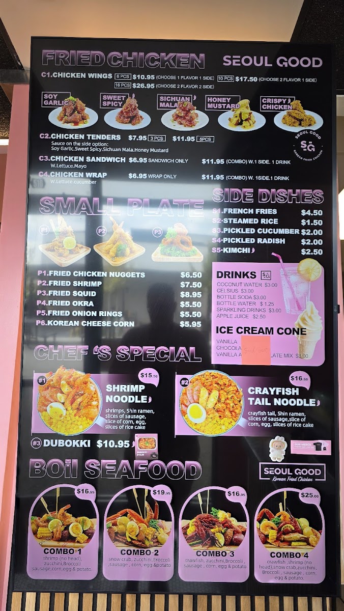 Seoul Good - Korean Fried Chicken offers a diverse and flavorful menu that caters to various tastes, with options ranging from seafood to fried chicken, sandwiches, and sides. If you're a seafood lover, the Boil Seafood Combos are a must-try. The combos include COMBO 1, COMBO 2, COMBO 3, and COMBO 4, each offering a satisfying assortment of seafood cooked to perfection. For those looking for small plates, there's a great selection like the P8 - Korean Crispy Corn Dog (1), the crispy and delicious P3 - Fried Squid, and the flavorful P7 - Kimchi-Jiggae. If you're craving some light bites, the P1 - Fried Chicken Nuggets and P - Skewer (1) are perfect for snacking.